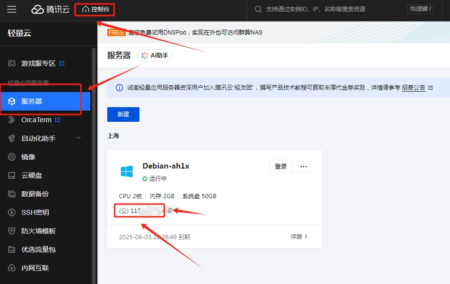 2. 购买服务器后,找到自己服务器的 公网IP,开始远程连接